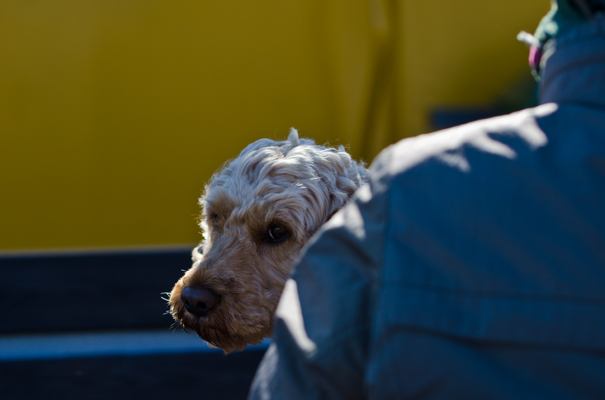 På färjan över till Holmön, Umeå, sitter man tryggt i mattes famn trots sjögång.
